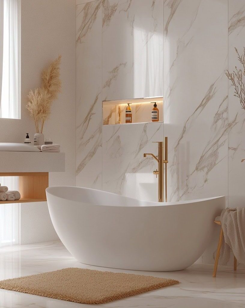 Luxury Spanish tiles with large formats and modern designs for high-end bathrooms.